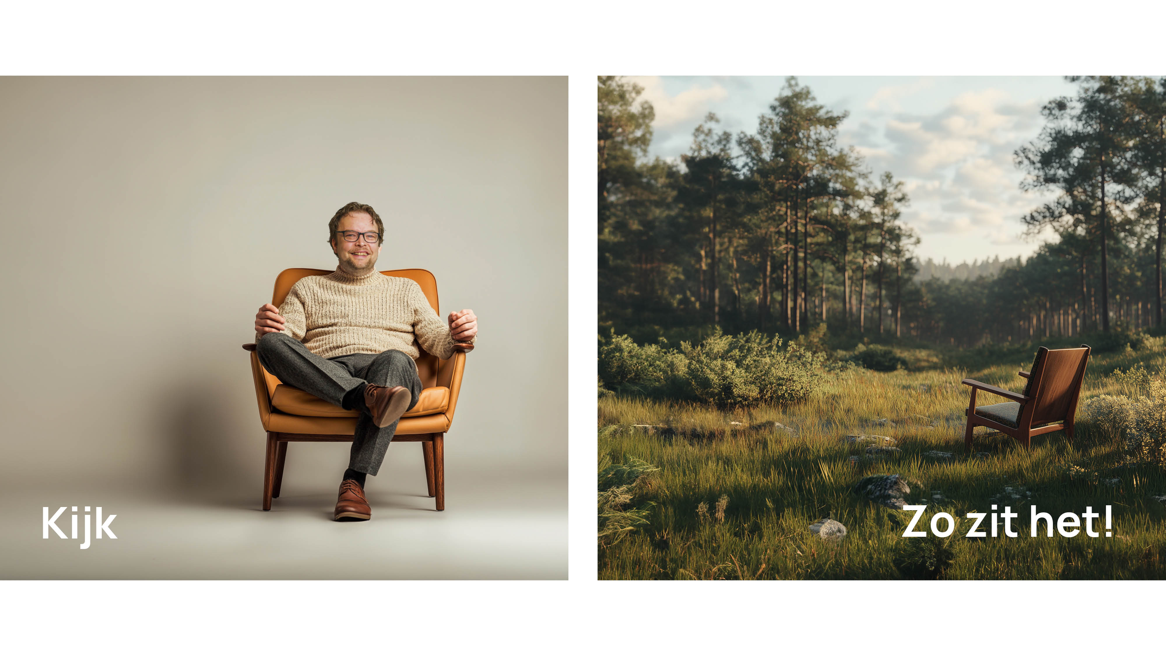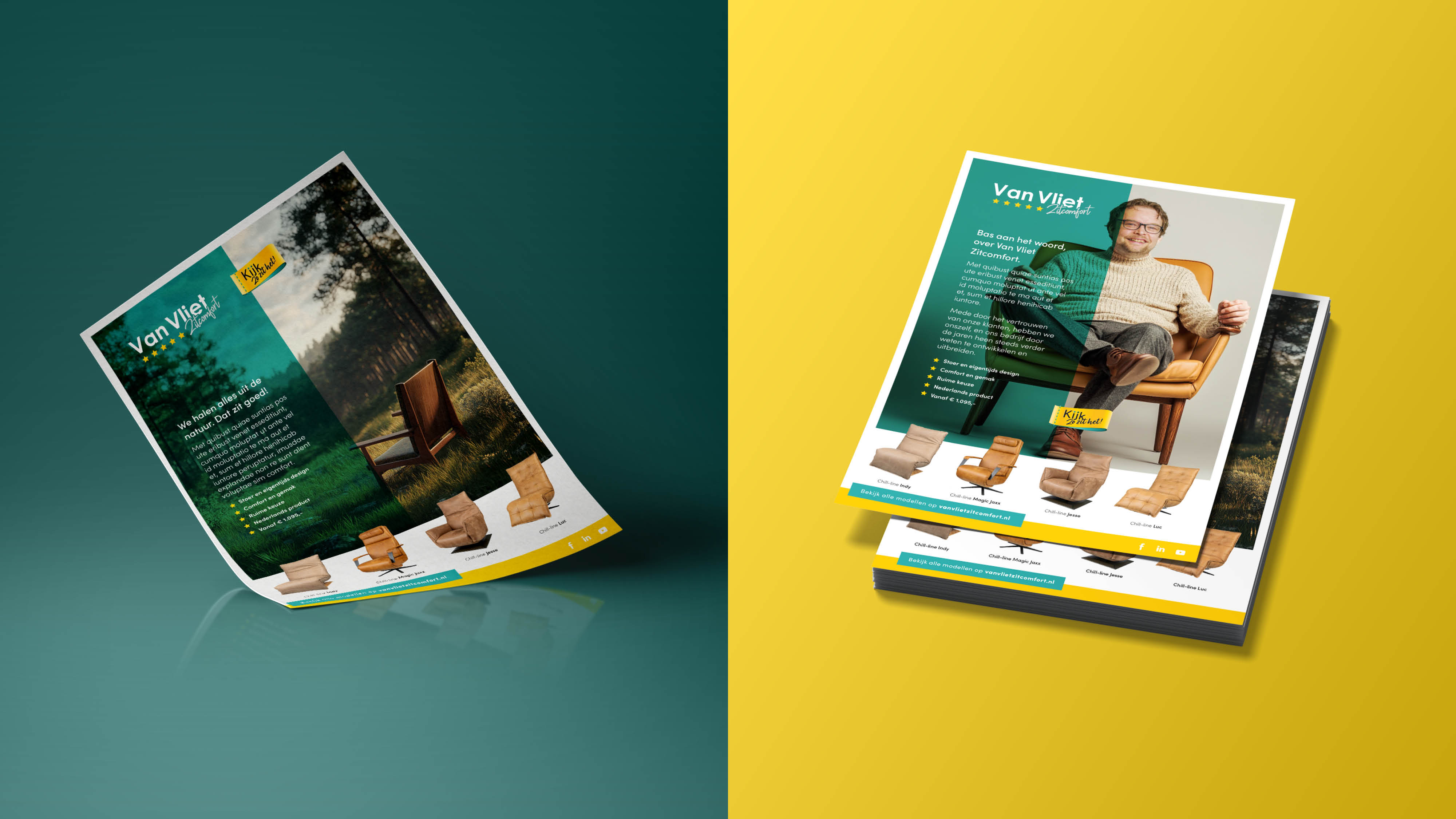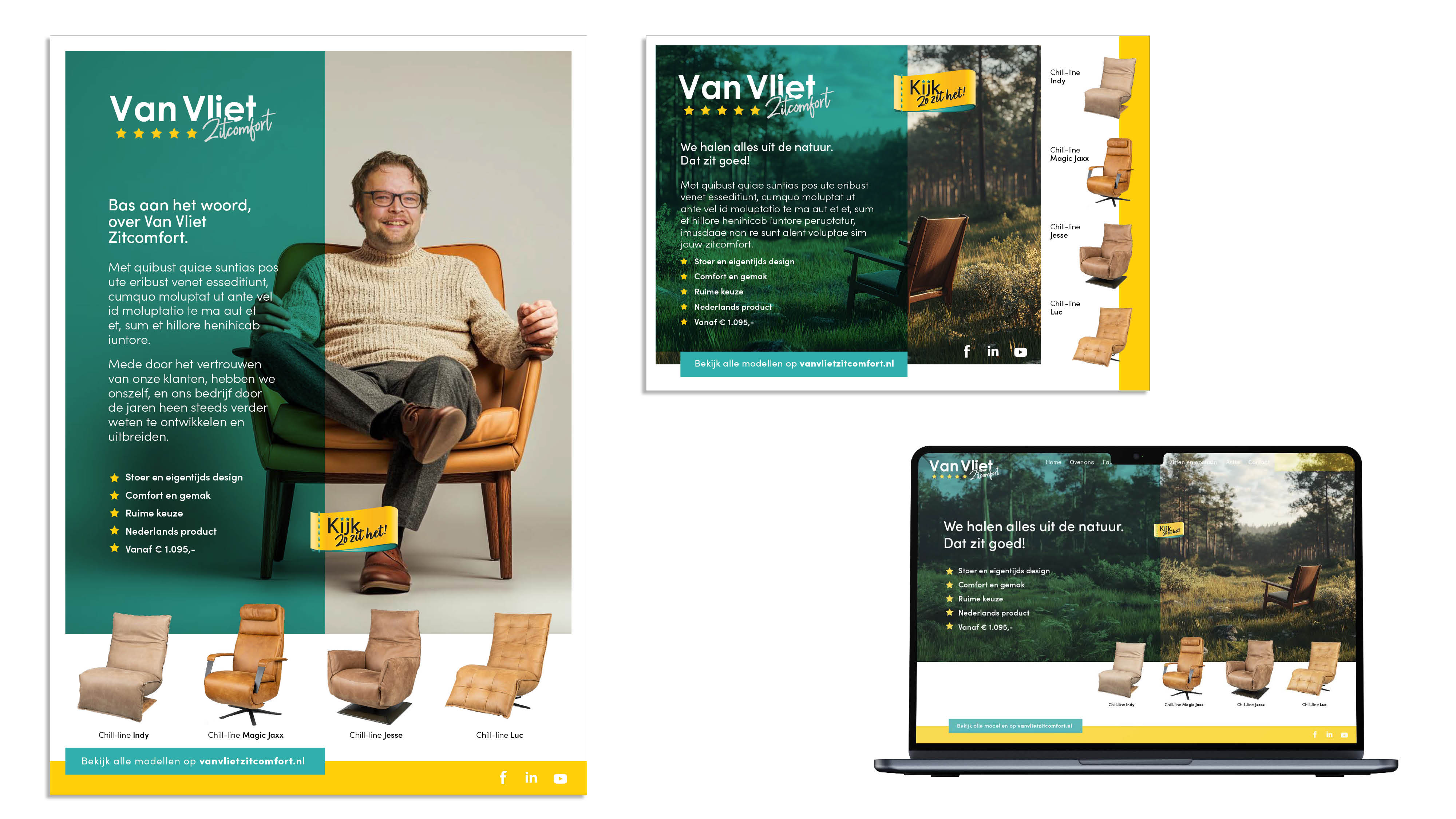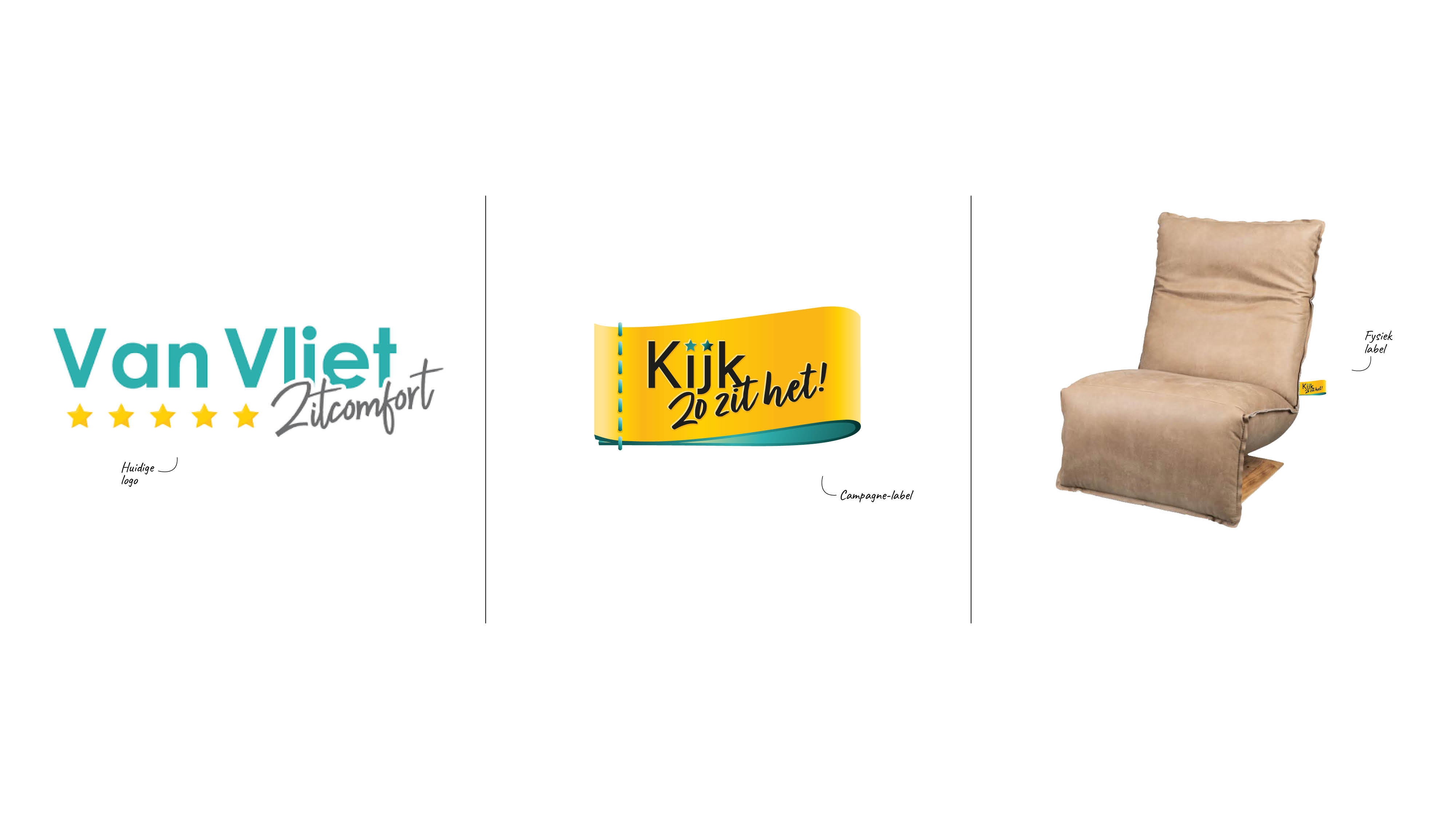 Ik ontwierp het campagne-label, geïnspireerd op fysieke labels aan meubels, en bouwde daar een nieuwe visuele stijl omheen. Het label fungeert als herkenbare drager van de slogan en brengt zowel de visie van Van Vliet als het zitcomfort dat ze bieden samen.