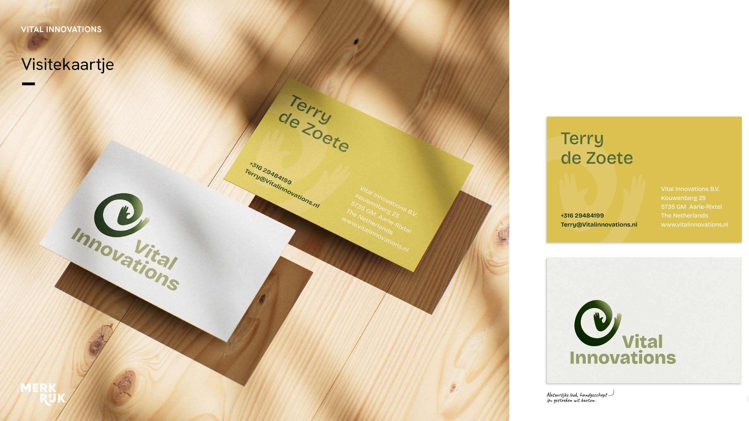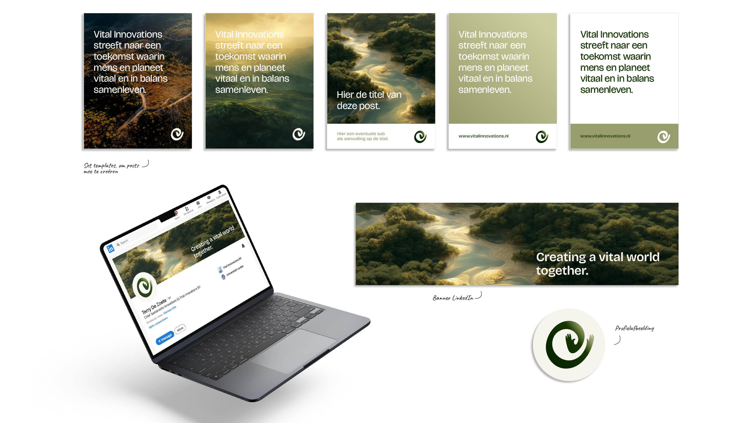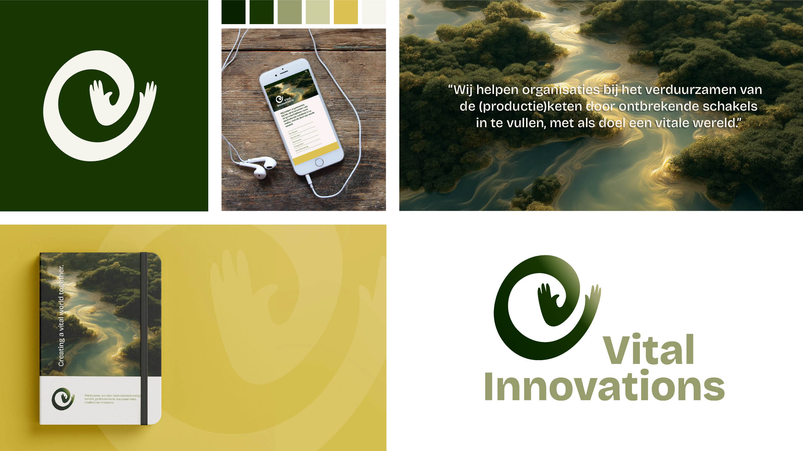 We begonnen bij de basis: de merkidentiteit. Wie is Vital Innovations, waar staat het voor, en waarin zit de onderscheidende kracht? Vanuit die kern ontwikkelde ik een branding die inhoud en uitstraling verbindt - helder, krachtig en klaar voor internationale groei.Het beeldmerk staat voor verantwoordelijkheid en betrokkenheid. De ronde, dynamische vorm verwijst naar de planeet en het proces, terwijl de open handjes omarmen wat aandacht en zorg nodig heeft.