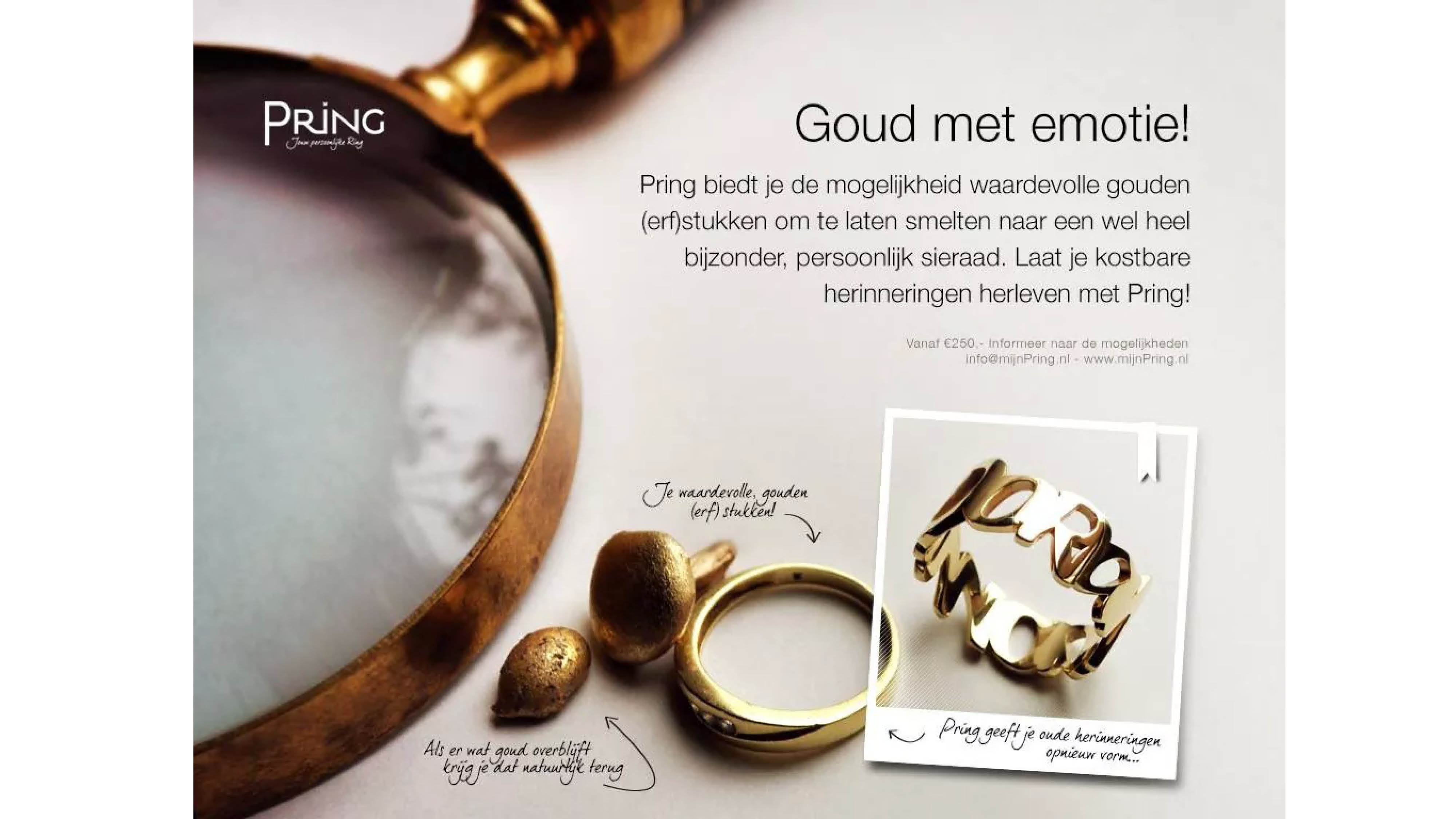 Met behulp van (de toen nog) nieuwe 3d-technieken ontwierp ik exclusieve ringen in edelmetaal, elk met een eigen verhaal. Ik begeleidde het volledige proces: van productontwikkeling en merkidentiteit tot fotografie, marketing en verkoop. Door die samenhangende aanpak wist Pring zich te onderscheiden en een herkenbare plek te veroveren binnen de sieradenwereld.
